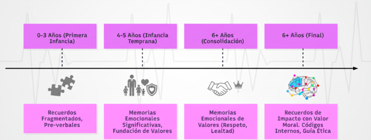 Figura 2. Línea de tiempo del desarrollo de la memoria: desde recuerdos fragmentados en la primera infancia hasta la consolidación de memorias de impacto con valor moral.